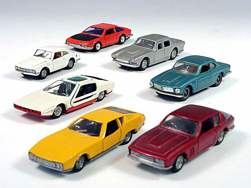 miniatures reproduisant les marques : FIAT, LAMBORGHINI, ISO, MASERATI, JAGUAR & JENSEN