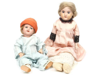 comprend : K&R en composition moule 728/4 - 36 cm environ - yeux bleus dormeurs (à revoir) - péruque en mohair (avec manques) - quelques marques d'usure et décolorations sur le corps - vêtements non d'origine & reproduction Armand Marseille, 50 cm environ sur corps en peau ancien avec restaurations (vêtements non d'origine)