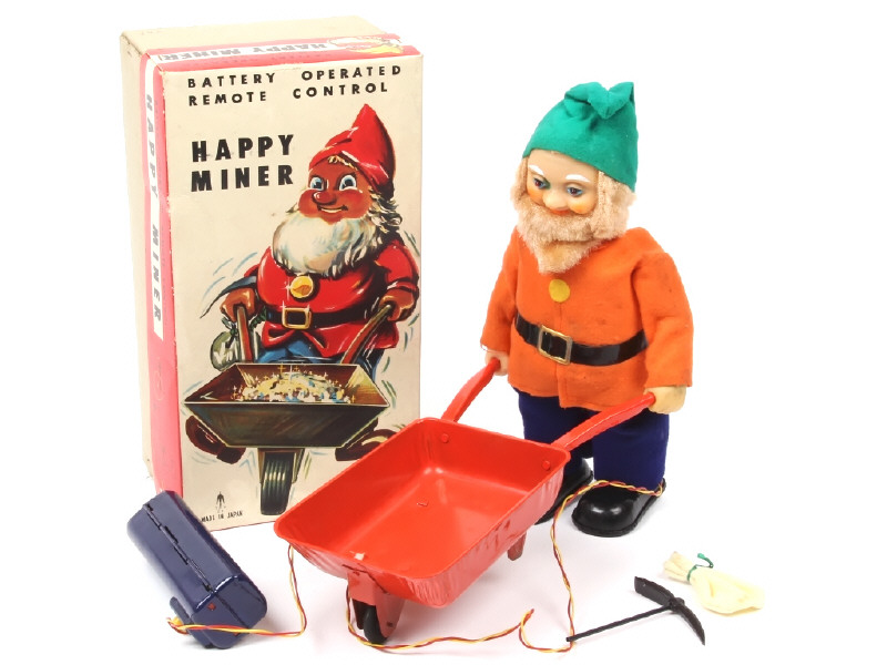 hauteur 28 cm - en action, le personnage avance en poussant sa brouette tandis que ses yeux s'allument (mécanismes fonctionnent) - avec sac & pioche