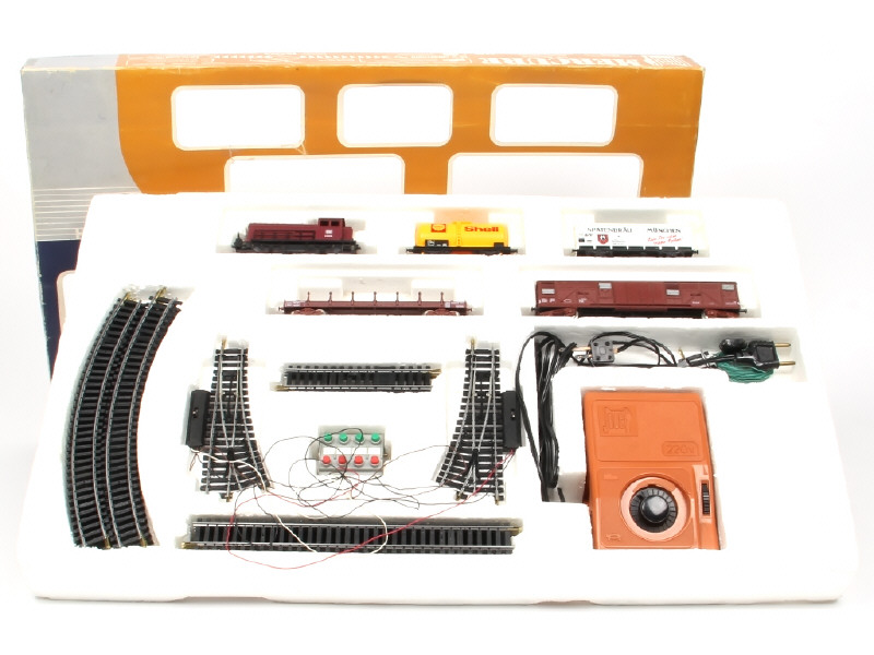 non testé - contient : motrice diesel 'DB' 245004, wagons de marchandises (4 exemplaires différents), un transformateur, rails droits, courbes, aiguillages & un accessoire de voie