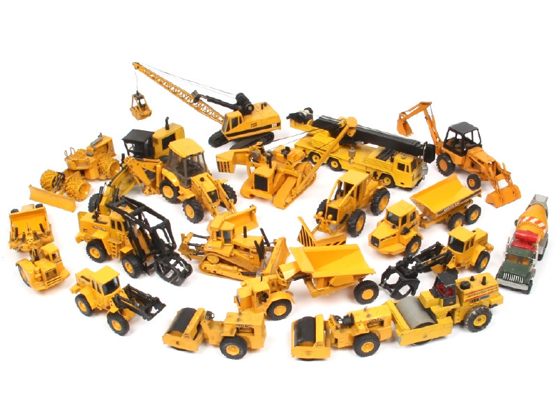 états de 'B' à 'D' - miniatures reproduisant notamment les modèles : CATERPILLAR, JCB, VOLVO & CASE - on y retrouve principalement les marques : JOAL, MAJORETTE - avec parties encrassées, cassées & manquantes