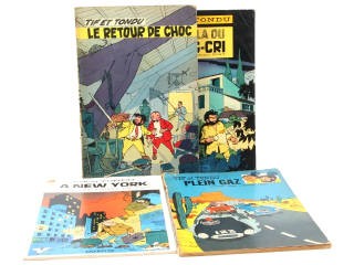 comprend : LE RETOUR DE CHOC (EO brochée Belge de 1958 - album en bon état - coiffes et coins frottés - une étiquette en page de titre - intérieur en très bon état bien compact et homogène - petite ouverture au niveau de la première page), PLEIN GAZ (EO brochée Belge de 1959 en état moyen - petits manques et frottements du dos - couverture un peu salie) & LA VILLA DU LONG GRIS (EO brochée de 1966 - très bon état intérieur bien compact et homogène) - on y joint TIF ET TONDU À NY en réedition brochée, en très bon état