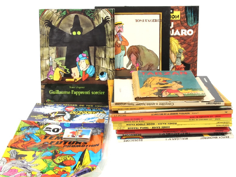 état de bon à très bon - comprend notamment : TARZAN (EO 1936 - état moyen), album PANINI 'LES CHEVALIERS DU ZODIAQUE (avec sachet d'origine, incomplet & avec quelques images non collées), rééditions de TINTIN, LUCKY LUKE & BLAKE & MORTIMER
