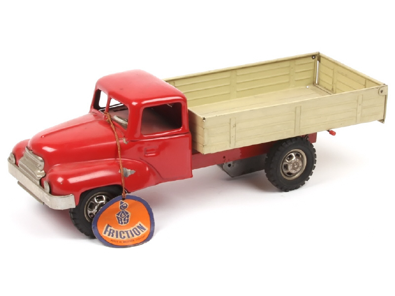 B.S (ALLEMAGNE) Camion plateau à ridelles basculant en tôle peinte rouge & jaune paille