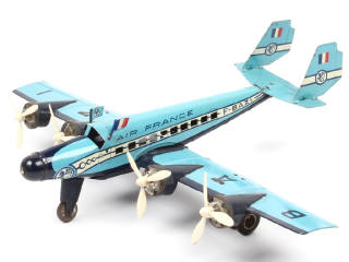 envergure 52 cm - avec moteur à friction entraînant des hélices (fonctionne) - parties chromées en grande partie ternies - avec traces d'oxydation plus ou moins importantes par endroits - frottements - manque une agrafe de maintien d'empennage