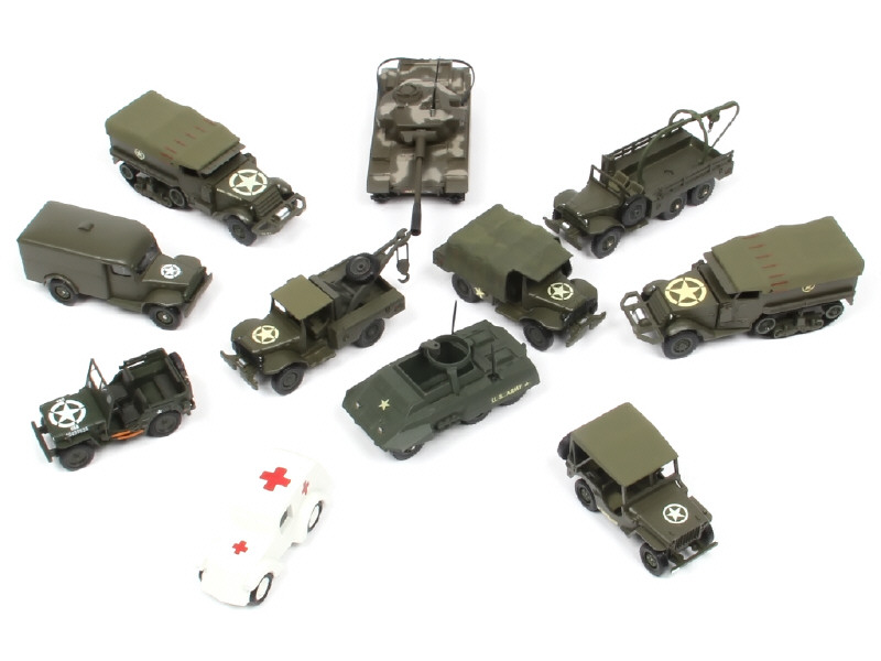 miniatures reproduisant notamment les modèles : DODGE, HALF TRACK, CENTURION & COMBAT-CAR M20 - on y retrouve notamment les marques : SOLIDO, SCHUCO & CORGI TOYS - quelques transformations, partie repeintes, accessoires cassés & d'autres manquants