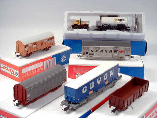 ROCO 'HO' (AUTRICHE) Ensemble de 6 wagons de marchandises & un camion draisine