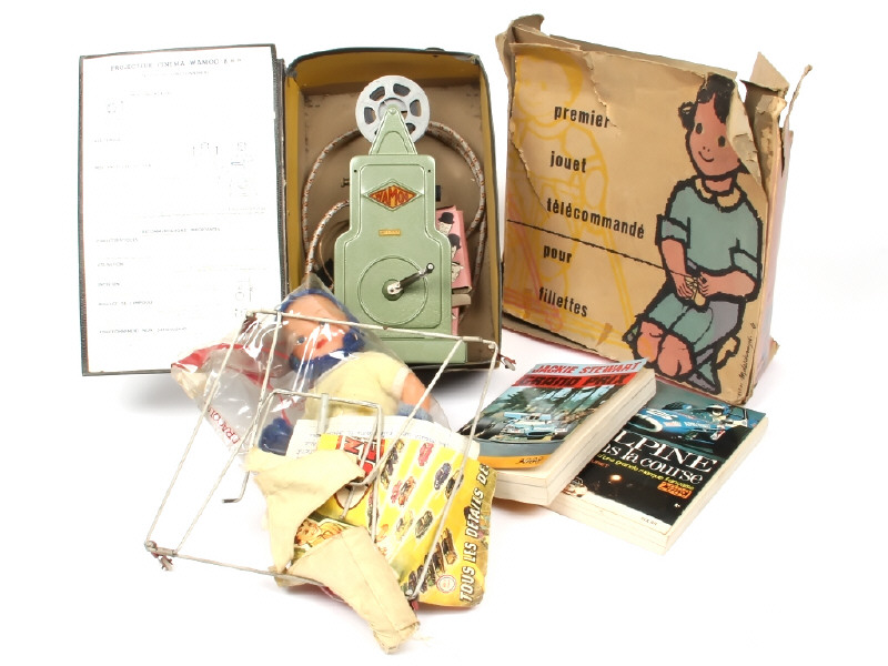 non testé - états de 'C' à 'D' - comprend : un projecteur-cinéma (marque WAMOO) & un poupon téléguidé - on y joint 2 livres de poche sur la formule1