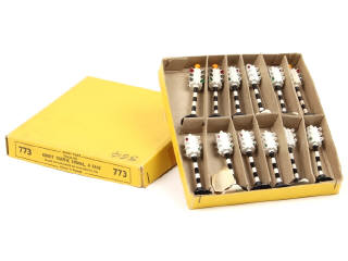 avec séparations intérieures - 2 annotations majeures - petites traces de rubans adhésifs - contient : 12 feux tricolores (états de 'A-' à 'C') - 3 exemplaires différents des autres - quelques étiquettes de détaillants collées sous certains socles