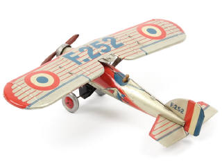 envergure 40 cm - moteur à ressort (à revoir) - produit de 1933 à 1955 - rayures & frottements plus ou moins importants par endroits - roues & axes restaurés & repeints - fixation d'hélice recollée