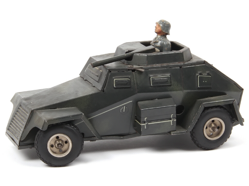 longueur : 18 cm - avec moteur à clef (à revoir), direction, système de pierre à briquet (à revoir) & soldat allemand (état 'C', non conforme) - manque 2 agrafes de plancher (une perforation sur celui-ci)
