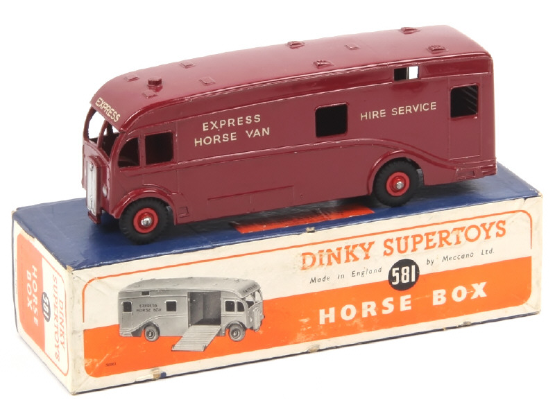 DINKY TOYS (GB) 581 HORSE BOX Transport de chevaux 'EXPRESS' bordeaux, jantes rouges