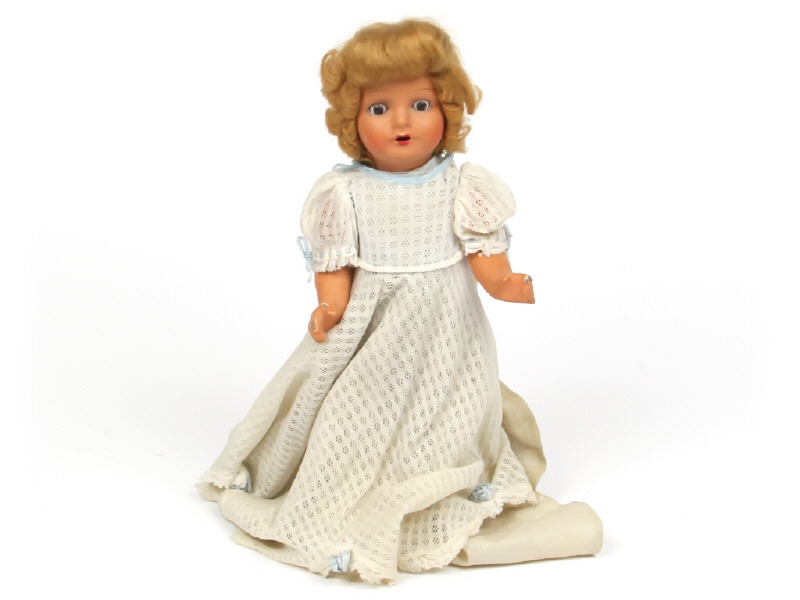 Taille : 30 cm environ - tête en biscuit (sans fêle apparent mais avec éclats de peinture), yeux dormeurs marron, bouche ouverte sur 2 dents - sans marquage en creux sur la nuque - corps en composition avec quelques éclats (un bras à refixer) - vêtements & pérruque anciens