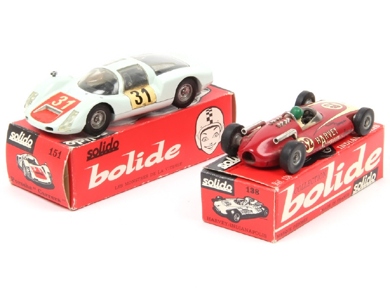 comprend : HARVEY INDIANAPOLIS (jantes ternies) & PORSCHE CARRERA (avec manques & une portière cassée - boite déformée)
