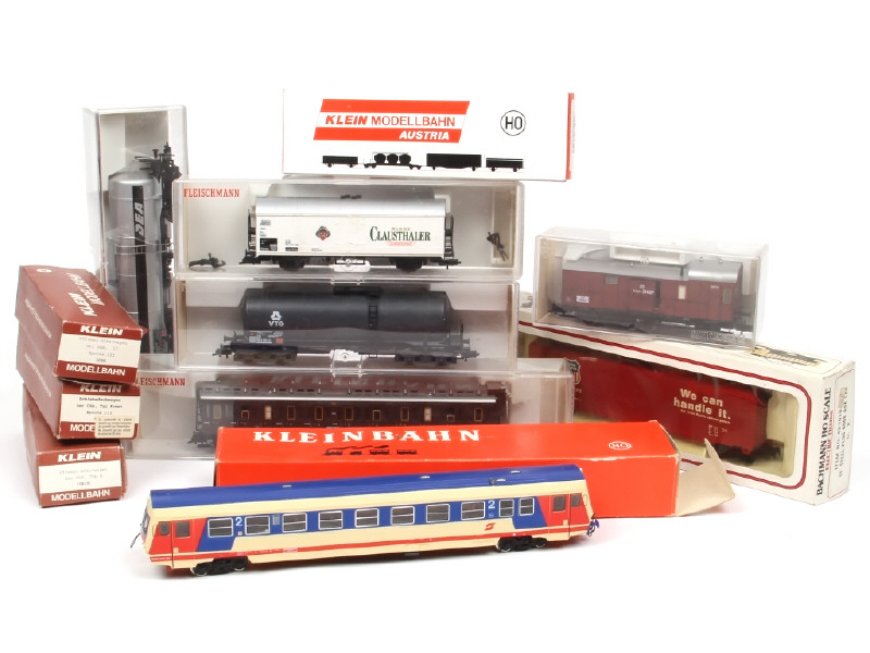 comprend : 9 wagons-marchandises, voiture-voyageurs & un autorail (non tresté) - on y retrouve les marques : KLEIN BAHN, FLEISCHMANN & BACHMAN - possibilités de petits accessoires cassés & manquants - quelques boites en état 'c'