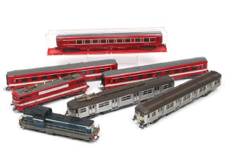 non testé - comprend : motrice électrique BB9288 'LE CAPITOLE', diesel BB 66150, autorail 2 éléments, 2 voitures-voyageurs & restaurant (boite en état 'c') - carrosseries plus ou moins poussièreuses