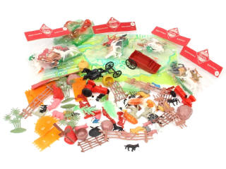 comprend : cow-boys à cheval, tracteurs, animaux de la ferme, moulins, barrières, éléments de décor & batiments - on y retrouve notamment les marques : REISLER (sous sachets jamais ouverts)