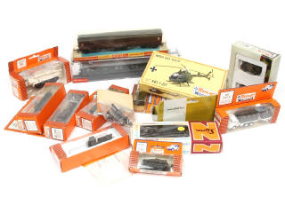 différents écartements - comprend : wagons de marchandises, voitures de voyageurs, rails & véhicules militaires - on y retrouve notamment les marques : ROCO, LIMA, GRAFAR & MINITANKS - quelques boîtes en état 'c'