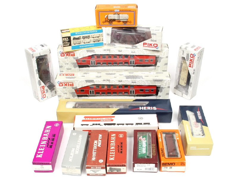 comprend : voitures-voyageurs & wagons marchandises - on y retrouve les marques : PIKO, KLEIN & BEMO - possibilité de petits manques