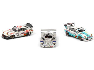 comprend les modèles : PORSCHE 911 GT2 (2 exemplaires) & LOLA - quelques petits accessoires manquants & cassés