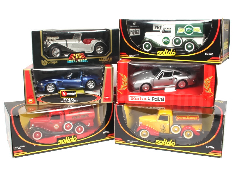 échelle 1/18ème - comprend les modèles : FORD (3 exemplaires), JAGUAR, BMW & PORSCHE - on y retrouve les marques : BBURAGO, SOLIDO & POLISTIL