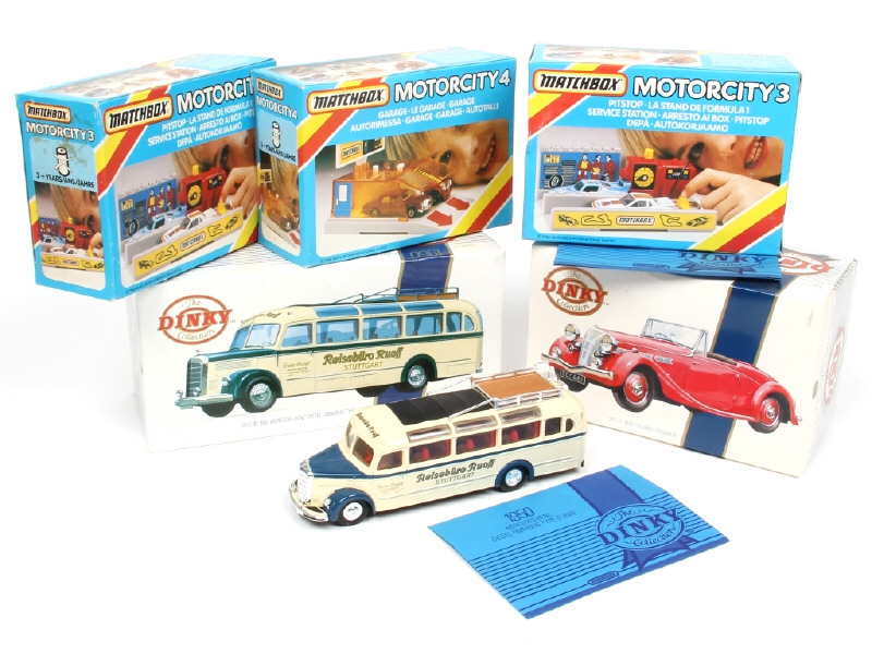 comprend : TRIUMPH DOLOMITE 1939 & MERCEDES-BENZ OMNIBUS TYPE 0-3500, garage & station-service (2 exemplaires) - on y retrouve les marques : DINKY MATCHBOX & MATCHBOX