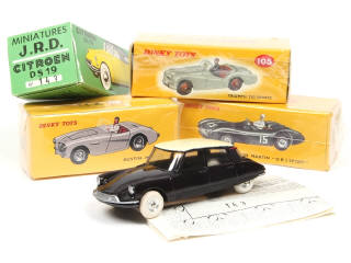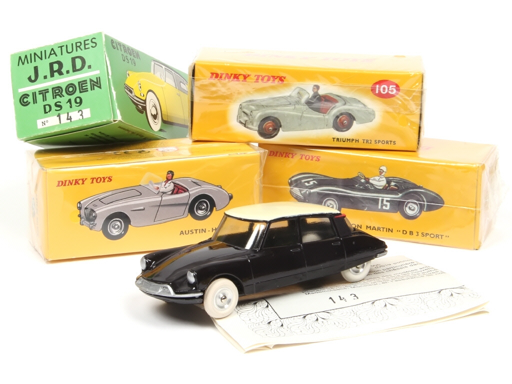comprend : TRIUMPH TR2, ASTON MARTIN DB3 & AUSTIN HEALEY - 2 exemplaires sous film plastique jamais ouvert - on y joint une CITROËN DS 19 de la marque JRD (réédition - A+-a)