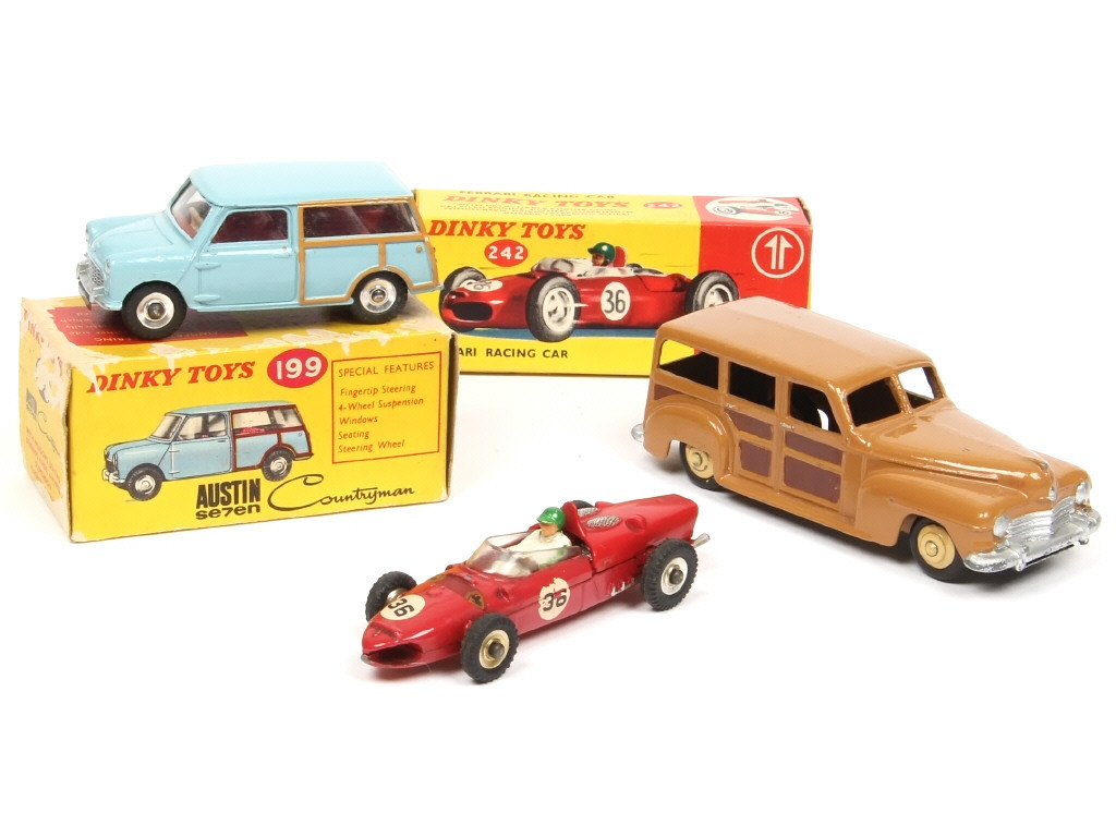 comprend : AUSTIN 7 CONTRYMAN ('A.c'), FERRARI RACING CAR ('C.a' - casque du pilote retouché - carrosserie encrassée) & PLYMOUTH break 'Woody' (en état 'R')