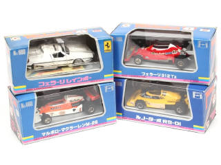 miniatures reproduisant les modèles : RENAULT, FERRARI (2 exemplaires diférents) & Mc LAREN