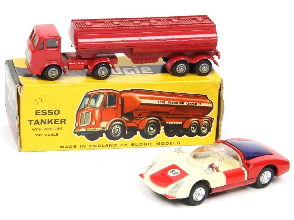 comprend : camion-citerne 'ESSO PETROLEUM COMPANY' ('B.b' - manque un autocollant) & PORSCHE CARRERA 6 ('A.-') - on y retrouve les marques : BUDGIE MODELS & JOAL