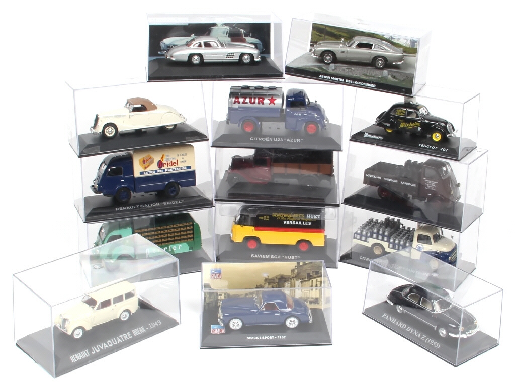 modèles vendus en kiosque - miniatures reproduisant notamment les modèles : ASTON MARTIN, MERCEDES, RENAULT, CITROËN, PEUGEOT & PANHARD - possibilité de petits manques & parties cassées