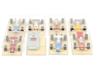 petite échelle - miniatures reproduisant notamment les modèles : FORD, HONDA, LOLA, LOTUS & FERRARI - quelques fêlures plus ou moins importantes sur 2 boites