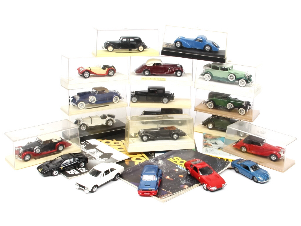 miniatures reproduisant notamment les modèles : FERRARI, ALPINE, DUESENBERG, JAGUAR, CORD, ROLLS ROYCE & RENAULT - possibilité de petits manques & parties cassées - 5 exemplaires sans boîte dont un repeint & un autre transformé - on y joint 5 catalogues de la marque