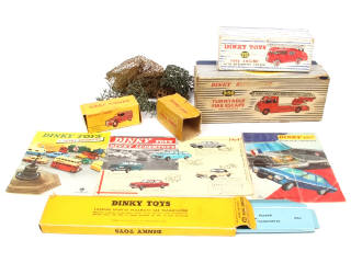 états de 'C' à 'E' - comprend notamment les références : 555, 956 & 25D (DINKY TOYS FRANCE - tachée) - on y joint 5 filets de camouflage dont certains non d'origine, une rampe de chargement (référence 994 - état 'A.d') & 3 catalogues 1957 (GB), 1964 & 1971 (FRANCE)