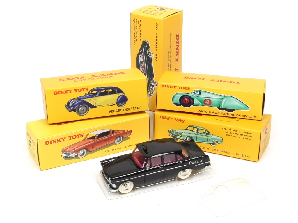 comprend : AUTO-UNION, STUDEBAKER COMMANDER, BORGWARD ISABELLA, OPEL REKORD & PEUGEOT 402 - boîtes plus ou moins décolorées