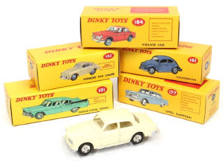 comprend : VOLVO 222 S (manque cale), DODGE ROYAL, OPEL KAPITAN, PORSCHE 356 & VOLKSWAGEN COCCINELLE - boîtes très légèrement décolorées par endroits