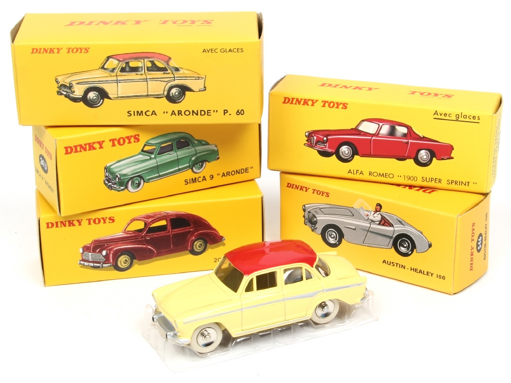 comprend : ALFA ROMEO 1900, SIMCA 9 ARONDE, P60, PEUGEOT 203 & AUSTIN HEALEY - boîtes très légèrement décolorées par endroits