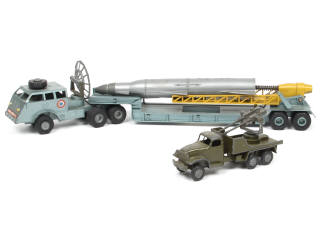 modèle proche de l'état 'C' - support de radar non conforme - manque cache-amorçe (mécanisme endommagé) - 2 perforations sur la rampe de lancement - on y joint un GMC plateau anti-aérien militaire en état 'E' (avec manques)