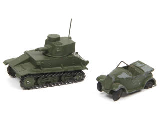 états de 'A' à 'E' - comprend : LIGHT TANK (version plancher tôle noir) & AUSTIN 7 tourer militaire une roue avec partie manquante - sans conducteur - traces de métal fatigue)