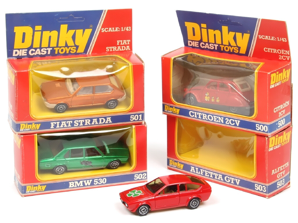comprend : BMW 530, FIAT STRADA, CITROËN 2CV & ALFA ROMEO ALFETTA GTV - une boîte avec traces de ruban adhésif & une autre en état 'c'