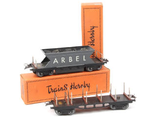 états de 'B' à 'C' - comprend : wagon-plateau à ranchers (2 fixations non d'origine, un support de ranchers cassé & recollé) & trémie 'ARBEL' (avec chargement non d'origine)