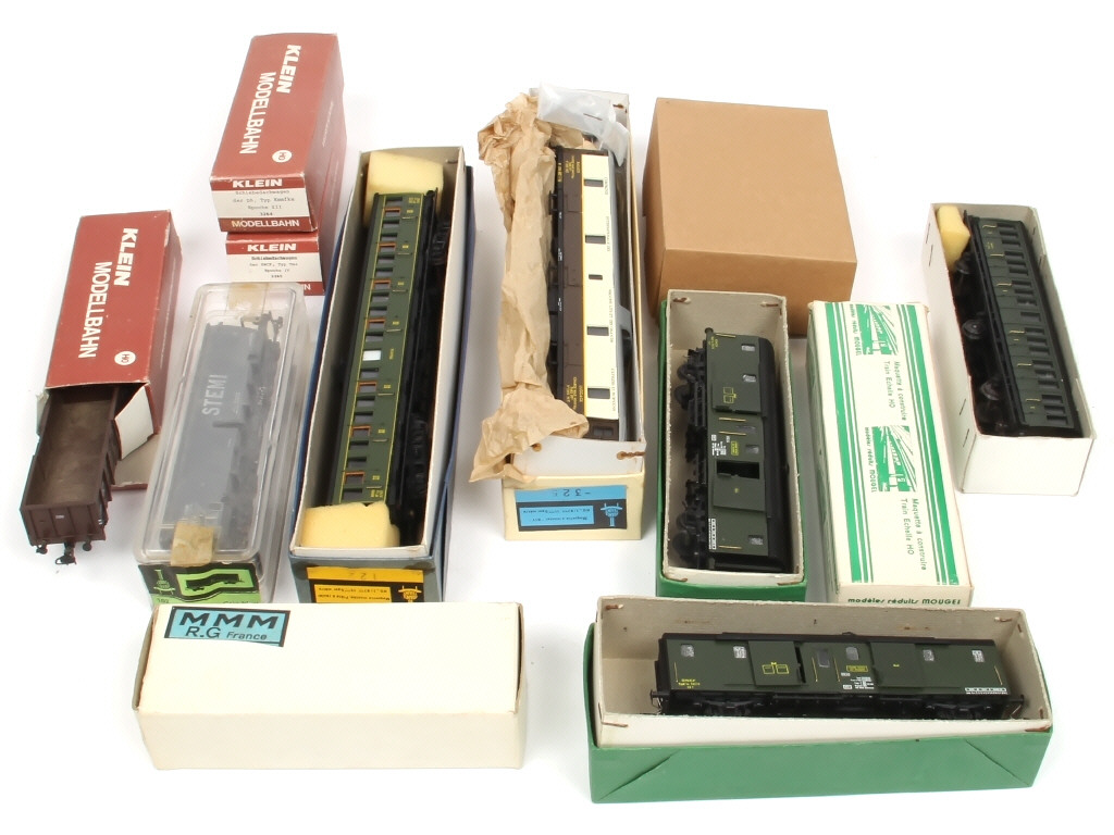 comprend notamment : voitures-voyageurs (dont une à monter) & wagons marchandises (4 exemplaires) - on y retrouve notamment les marques : FRANCE TRAINS, MMM & KLEINBAHN - possibilités de petits manques, parties cassées & traces d'oxydation