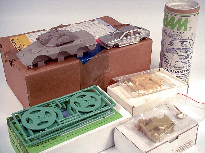 miniatures reproduisant un blindé RENAULT, 2 groupes de démarrage, des rouleaux de déminage & une AUDI QUATTRO - on y retrouve les marques GASO-LINE, MARTIN, MD, GRAPHY-AIR & BAM - sans garantie sur la présence de toutes les pièces