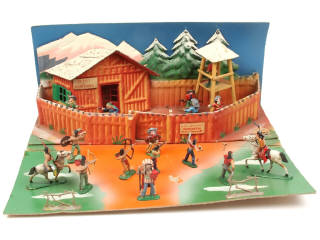 dimensions : 46 x 36 x 19 cm - avec éléments de décor, 8 indiens, 6 cow-boys & d'Artagnan banni - une figurine avec parties séchées - quelques petits manques sur les figurines & le diorama - couvercle de boite décoloré & tâché
