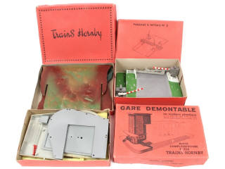 états de 'B' à 'C' - comprend : une gare démontable (référence 22A), passage à niveau (n°2) & un tunnel démontable (une fixation cassée avec petites fêlures) - possibilité de petits accessoires manquants - une boîte en état 'b'