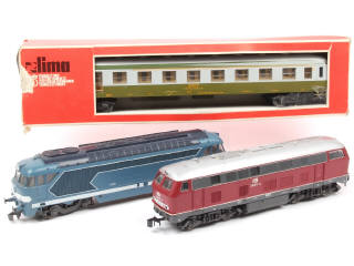 non testé - comprend : une motrice diesel 67001 'SNCF', 216011-7 'DB' & une voiture de voyageurs de première classe (boîte en état 'e') - on y retrouve les marques : LIMA & RIVAROSSI - avec frottements plus ou moins importants sur les carrosseries, petits éléments cassés, manquants & d'autres plus ou moins déformés