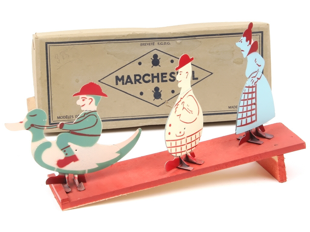 les personnages descendent la rampe en oscillant grâce à leurs supports mobiles - petits accrocs sur la boîte