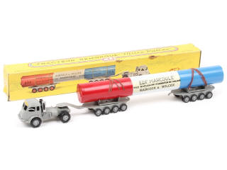 version avec décalques 'BOURGEY-MONTREUIL' sur le fronton de la cabine du tracteur & pile avec décalques 'BABCOCK & WILCOX MARCOULE' - quelques frottements sur l'attelage d'une remorque - taches sur la boîte par endroits