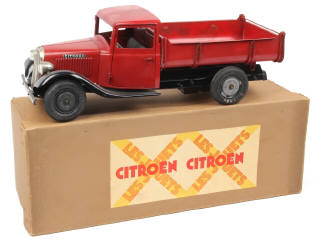 longueur 43,5 cm - fabrication de 1936-1939 - avec moteur à clef (fonctionne), clef, direction, phares & plaque minéralogique arrière (lettrage déformé) électriques (non testés) - banquette désolidarisée - traces d'humidité plus ou moins importantes par endroits (principalement sur les jantes & la benne) - cabine très légèrement déformée (très légères traces de métal fatigue sous la peinture) - quelques frottements (dont certains majeurs effectués notamment sous les phares) permettant le bon fonctionnement de ceux-ci - boîte légèrement décolorée, tachée avec une petite déchirure sur un côté - BON ETAT POUR UN MODELE DE CETTE EPOQUE !