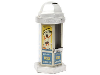 hauteur 26 cm - modèle en tôle lithographiée - une pièce de monnaie actionnait le mécanisme de distribution, permettant d'obtenir un carré de chocolat à l'aide de la tirette (fonctionne) - sans rhodoïd - quelques parties chromées plus ou moins ternies